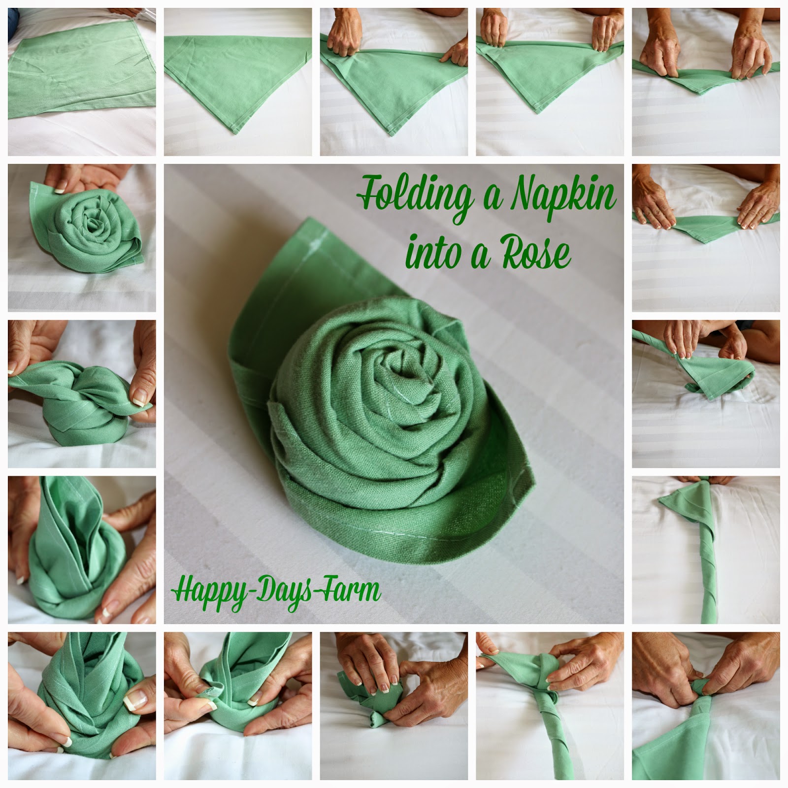 Dette foto-collaget fant jeg på happy-days-farm.com som forklarer ganske enkelt hvordan man kan brette roser av tøyservietter, og jeg valgte lin fordi 1) det kan absorbere opp til 20 % av egen vekt i fuktighet, 2) det er holdbart, og 3) det tørker fort – gode kvaliteter for en tøyserviett!